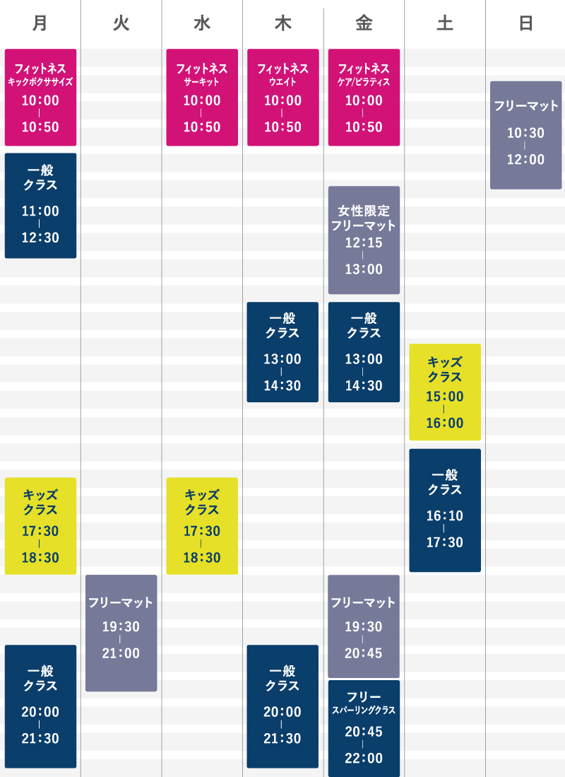 上記の時間帯は自由練習が可能です。テクニックの反復練習や研究、またはスパーリングなどにご利用ください(要事前連絡)。